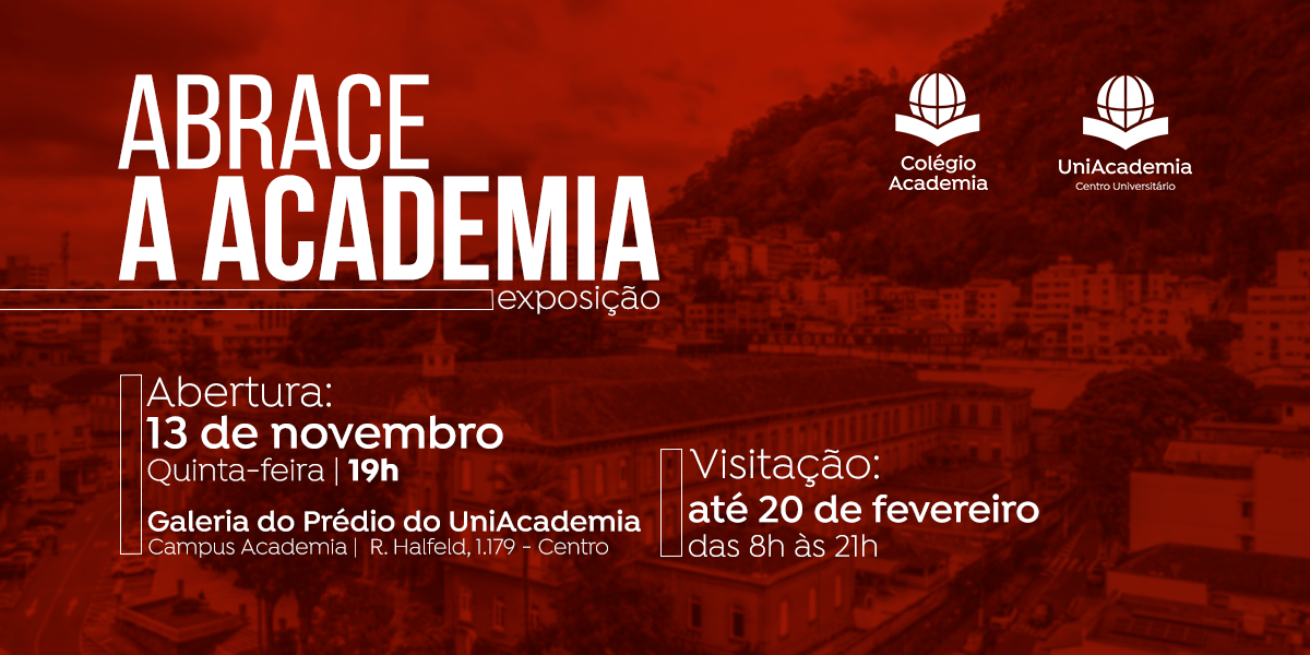 A Galeria de Exposições do prédio UniAcademia, no Campus Academia, recebe a mostra “Abrace a Academia”, que será aberta ao público no dia 13 de novembro de 2025, às 19h, e ficará em cartaz até 20 de fevereiro de 2026, com visitação de segunda a sexta-feira, das 8h às 21h.