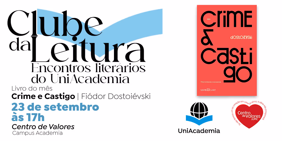 O UniAcademia, por meio do Centro de Valores, promove, no dia 23 de setembro, às 17h, o quarto encontro do Clube da Leitura: Encontros Literários do UniAcademia. A obra escolhida para esta edição é Crime e Castigo, do escritor russo Fiódor Dostoiévski, uma das obras mais importantes da literatura mundial. O romance explora questões profundas sobre moralidade, culpa, justiça e a complexidade da natureza humana, convidando os leitores a refletirem sobre dilemas éticos e existenciais.
